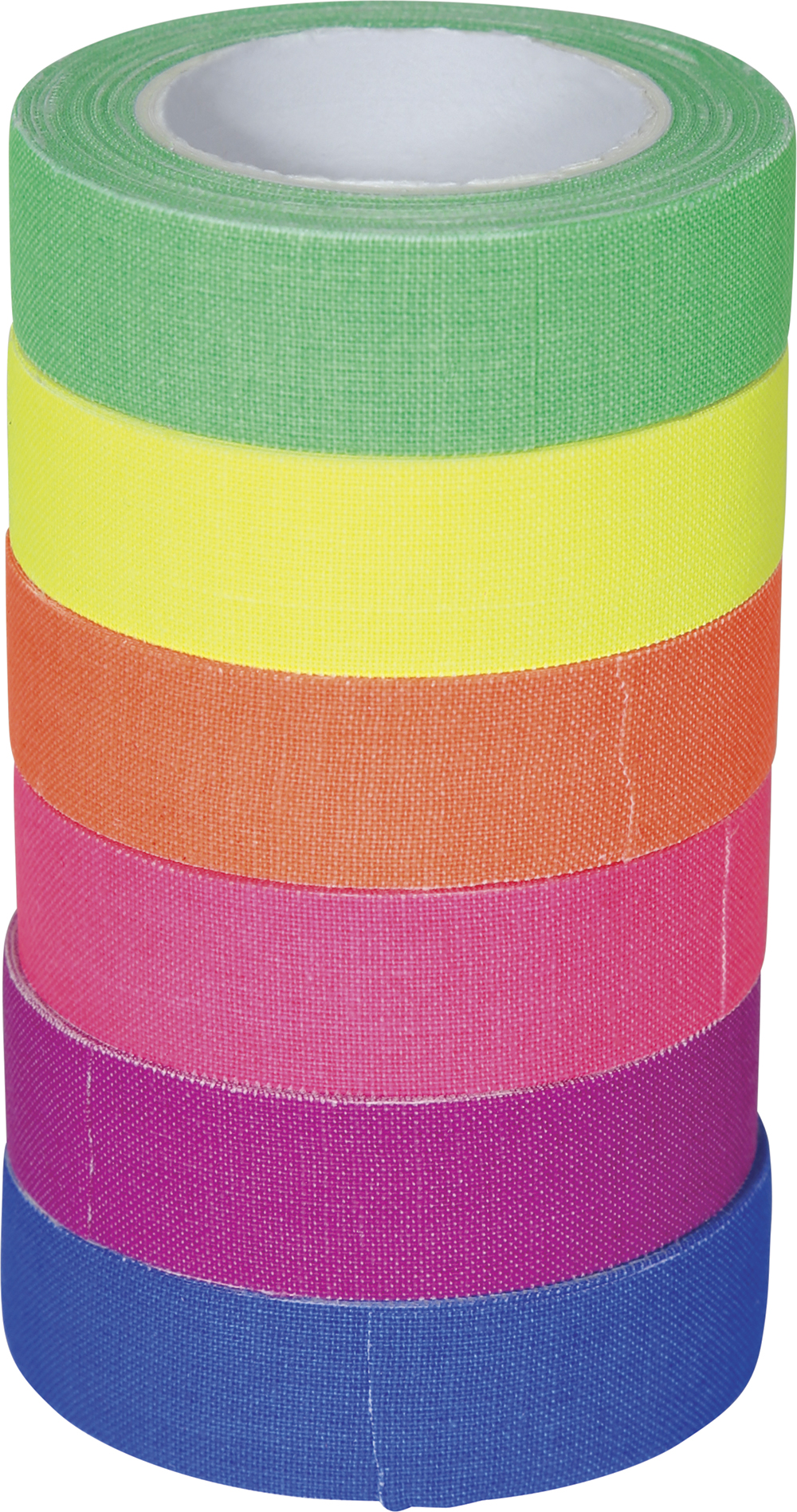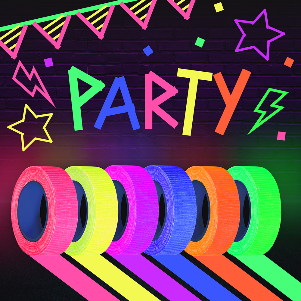 Lepící pásky v neonových barvách, svítící pod UV světlem. Můžete jí použít k dekoraci Vaší párty ve stylu Disco, nebo k výrobě nápisů zářících v UV světle. Balení obsahuje 6 ks lepících pásek o délce 5m, které se dají jednoduše trhat rukou. Fluorescenční neonové barvy září pod černými UV světly a poskytují super cool efekty na večírcích a akcích v retro stylu.