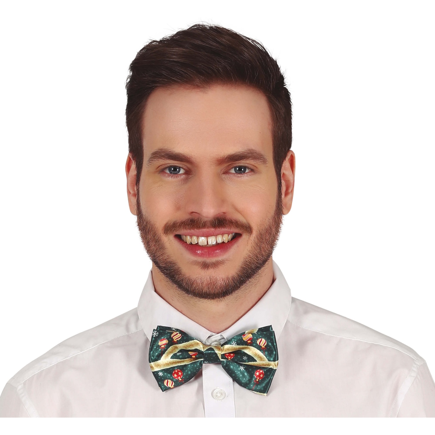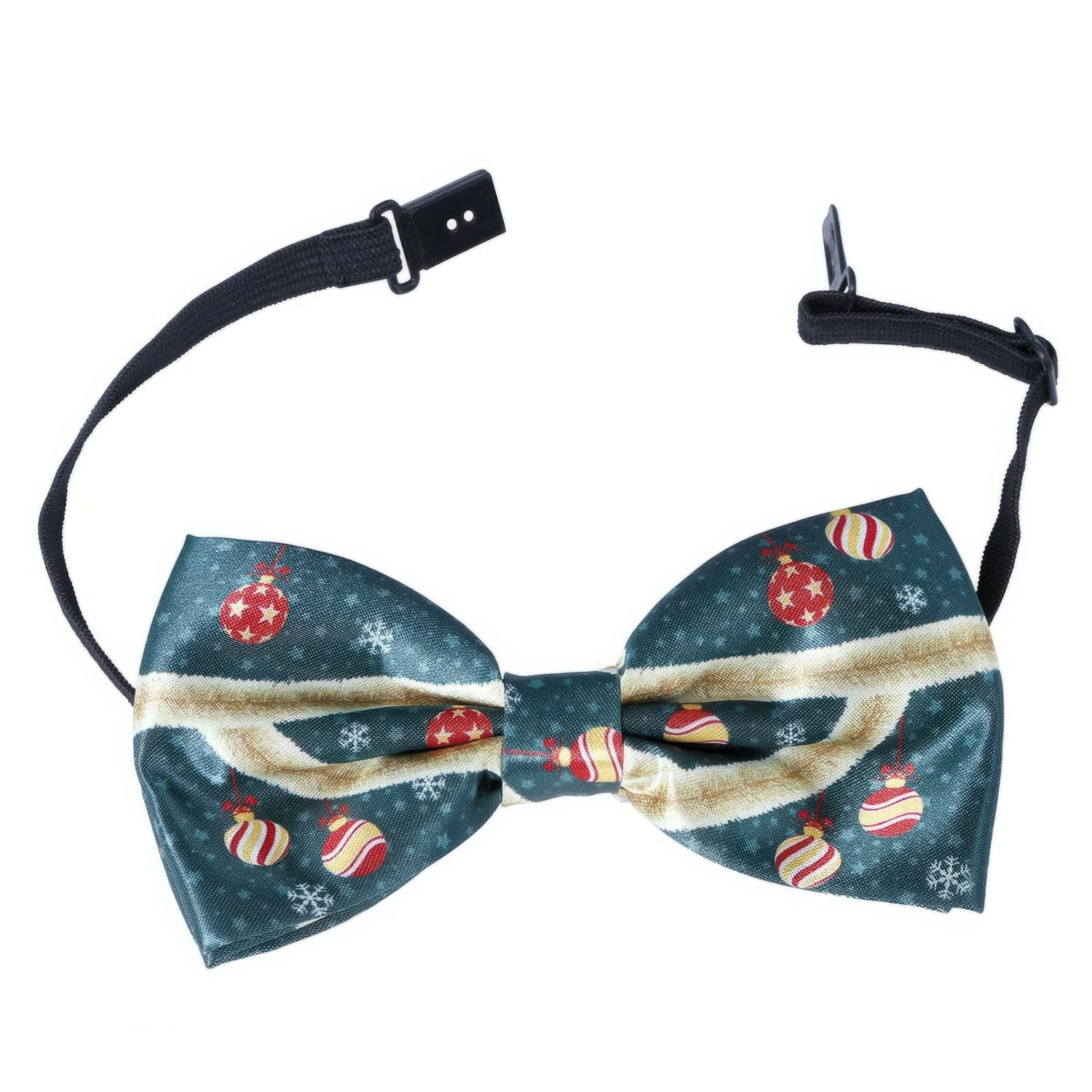 Vánoční motýlek s potiskem vánočních koulí a jemných vloček je zábavným, ale zároveň elegantním doplňkem na jakoukoli zimní či sváteční akci. Má tmavě zelený podklad, na kterém výrazně vynikají červené a zlaté ozdoby. Díky nastavitelné pásce se motýlek snadno přizpůsobí a pohodlně sedí na krku.