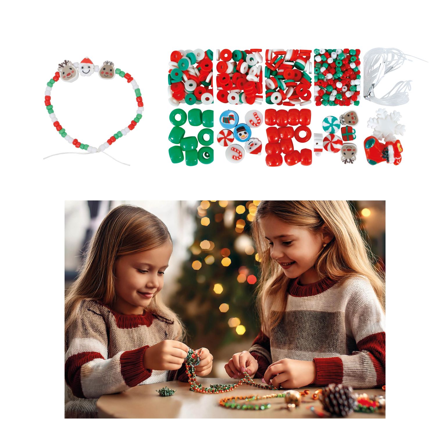 Tato sada pro výrobu vánočních náramků obsahuje 450 kusů barevných korálků a tematických přívěsků s motivy sobů, sněhuláků, dárečků, cukrovinek a dalších zimních symbolů. Díky kombinaci klasických tvarů a veselých vánočních postaviček si děti i dospělí snadno vytvoří vlastní originální náramky a drobné ozdoby.