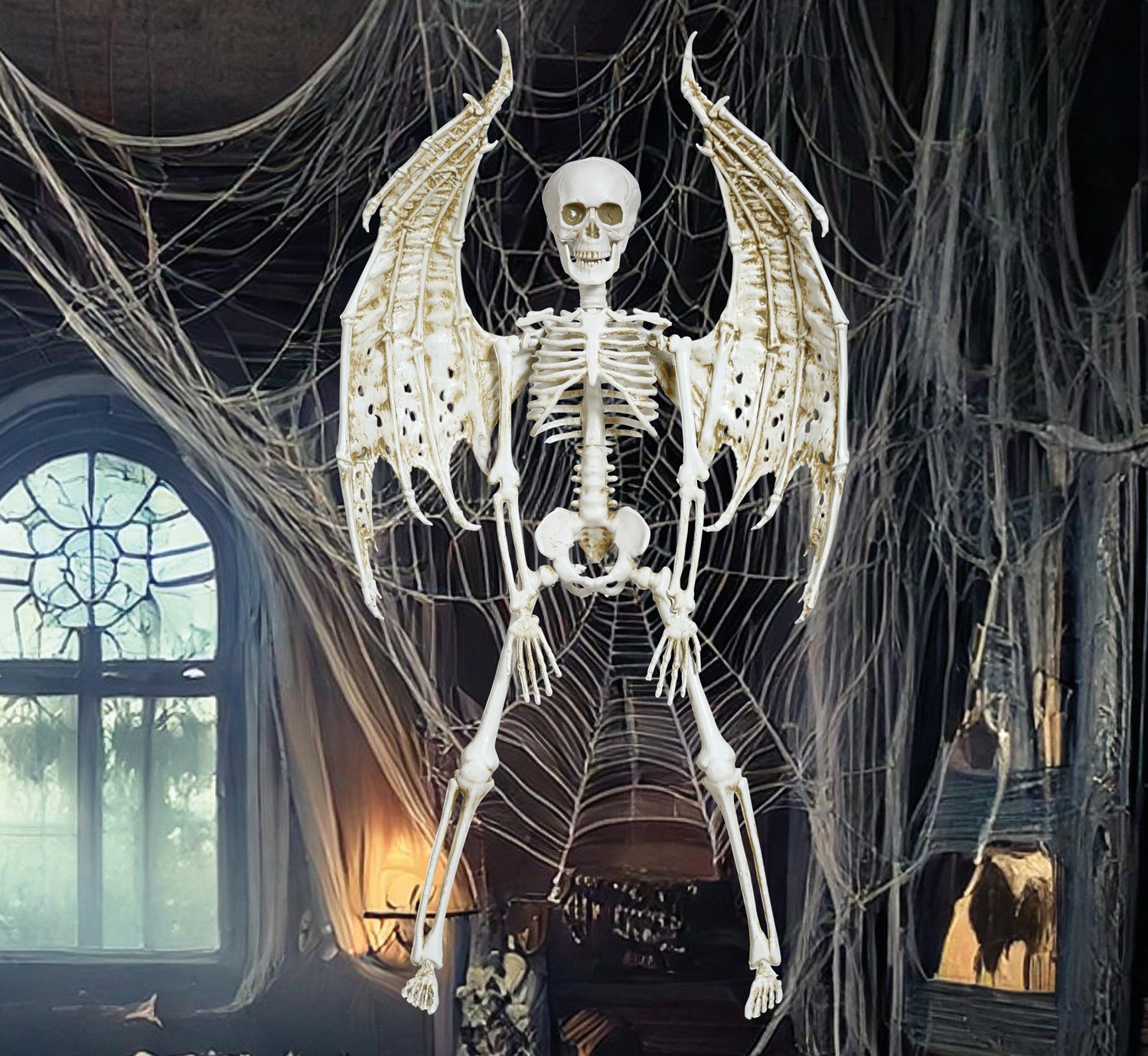 Strašidelný visící kostlivec s křídly o velikosti 40 cm je ideální halloweenská dekorace pro interiér i exteriér. Díky detailnímu provedení působí děsivě a skvěle doplní strašidelnou výzdobu.