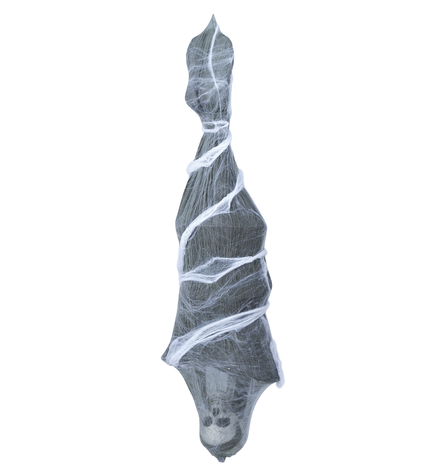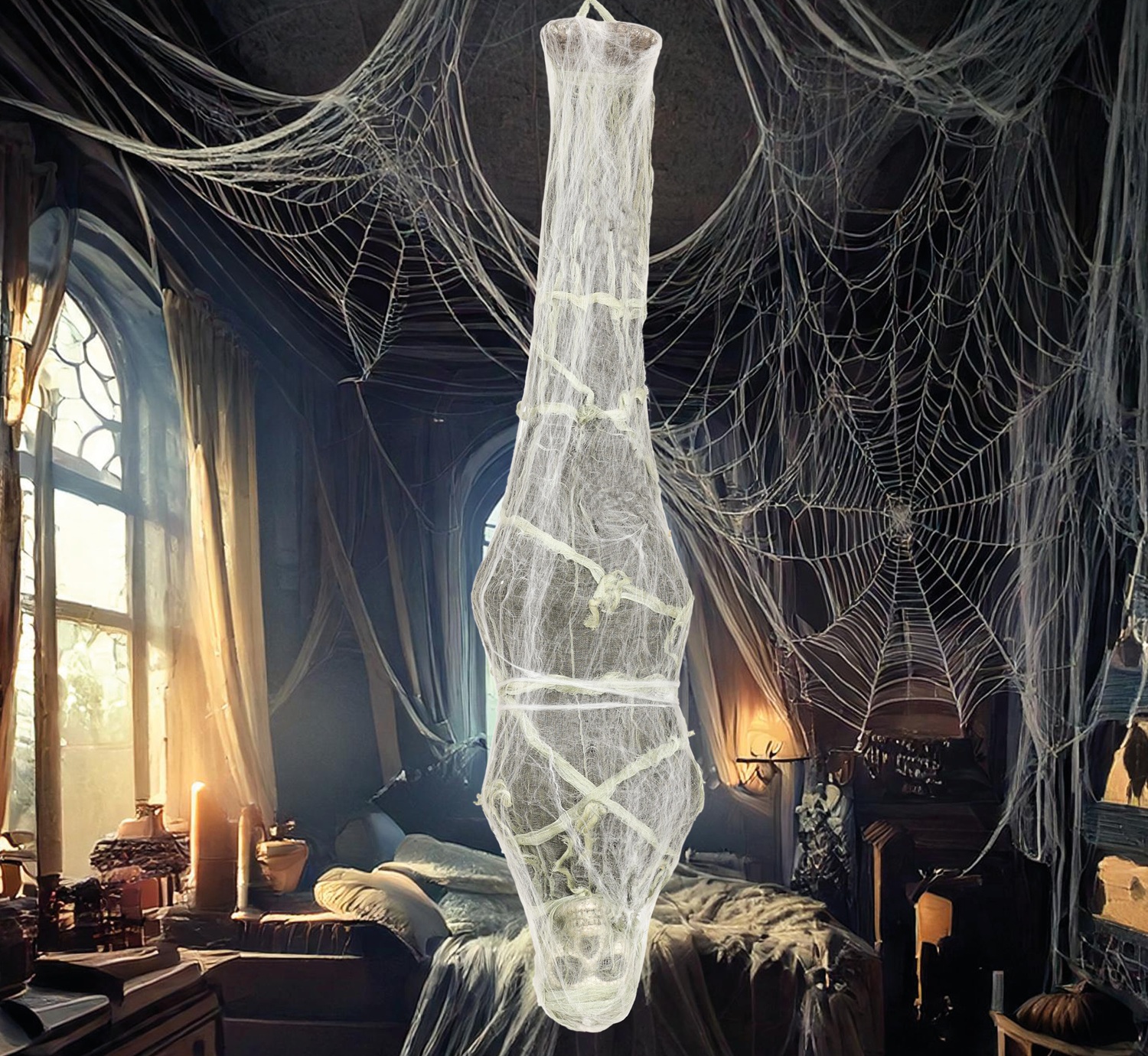 Visící kostlivec zabalený v husté pavučině je perfektní doplněk pro vytvoření mrazivé halloweenské dekorace. Díky délce 120 cm se stane nepřehlédnutelným prvkem každé strašidelné scény a navodí dojem, že se u vás uhnízdil obří pavouk. Tento visící prvek působí velmi realisticky a dodá vašemu prostoru pořádnou dávku hrůzy. Skvěle se hodí na zavěšení do rohu místnosti, na strop, do vstupního prostoru nebo do exteriéru, kde přiláká pozornost všech kolemjdoucích. S tímto děsivým doplňkem bude vaše halloweenská party naprosto nezapomenutelná.