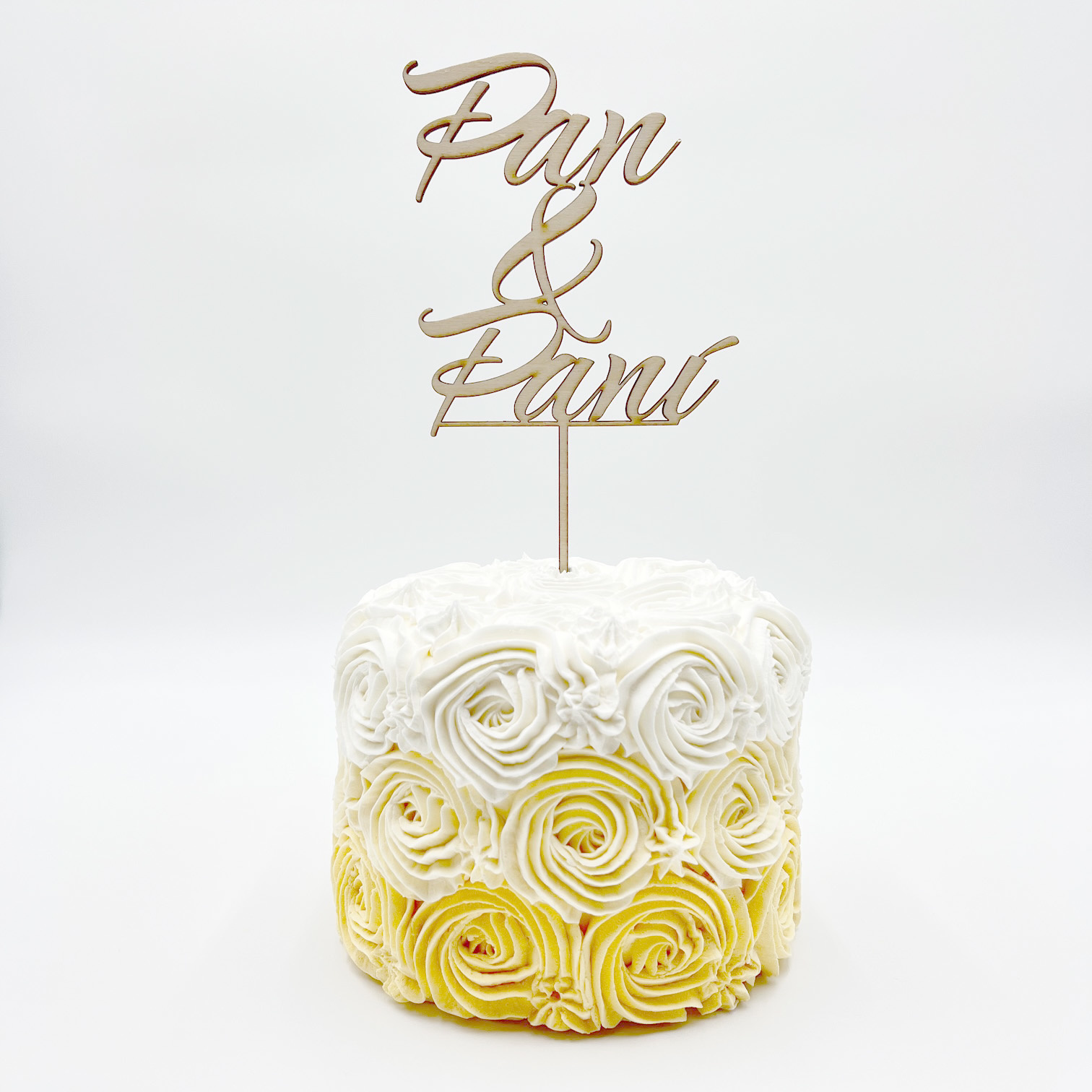 Ozdobný dřevěný zápich na dort ve tvaru nápisu Pan a Paní. Tahle dekorační libůstka, které se někdy říká topper nebo jednoduše dekorace na dort, Vám ozdobí dort jedna báseň.