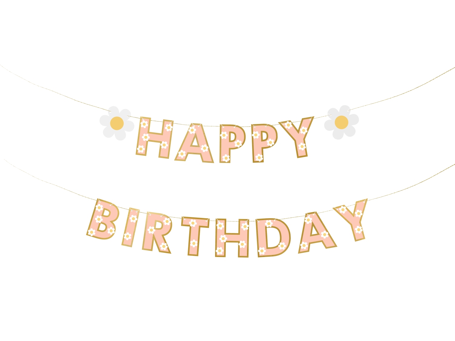 Závěsný banner Happy Birthday s motivem drobných kopretin je skvělým doplňkem narozeninové výzdoby v jemném, hravém a přírodním stylu. Díky pastelově růžovým písmenům s bílými kvítky působí dekorace svěže a perfektně ladí s boho tématikou, dětskou oslavou i dívčí narozeninovou party.