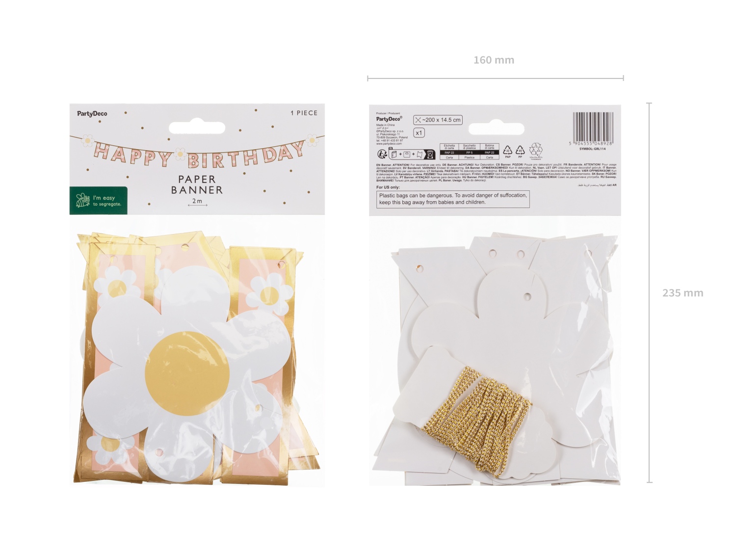 Banner má délku 200 cm a výšku cca 14,5 cm. Součástí jsou dvě části nápisu (HAPPY a BIRTHDAY) doplněné motivy kopretin po stranách. Jednotlivé prvky jsou navlečeny na provázku, takže stačí jen zavěsit na zeď, nad slavnostní stůl, na zahradu nebo do fotokoutku.