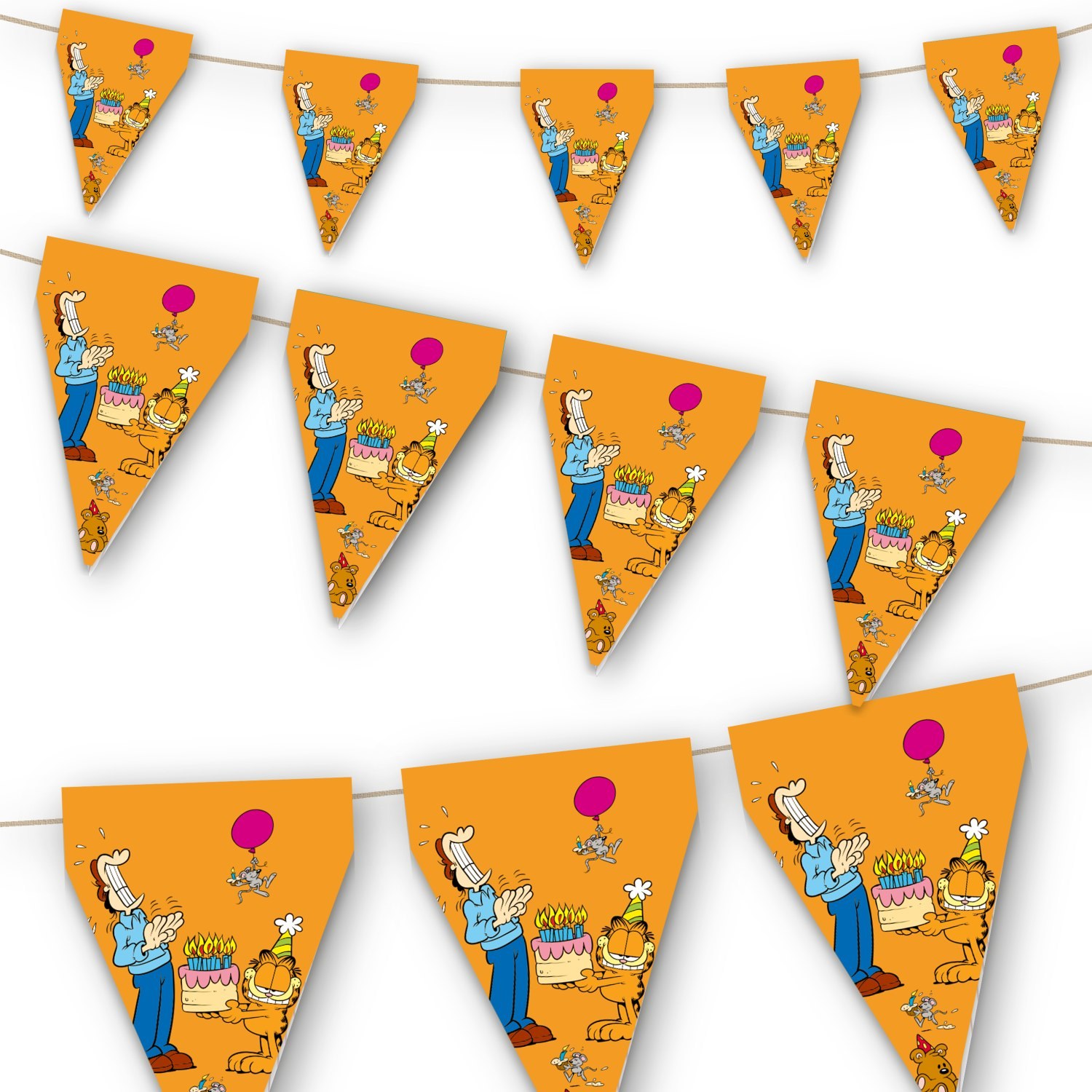 The 3-meter Garfield flag garland is a simple but very effective way to add the right atmosphere to a celebration. The cheerful motif of Garfield and his typical humor will appeal to children and adults and will fit perfectly into a themed birthday party.