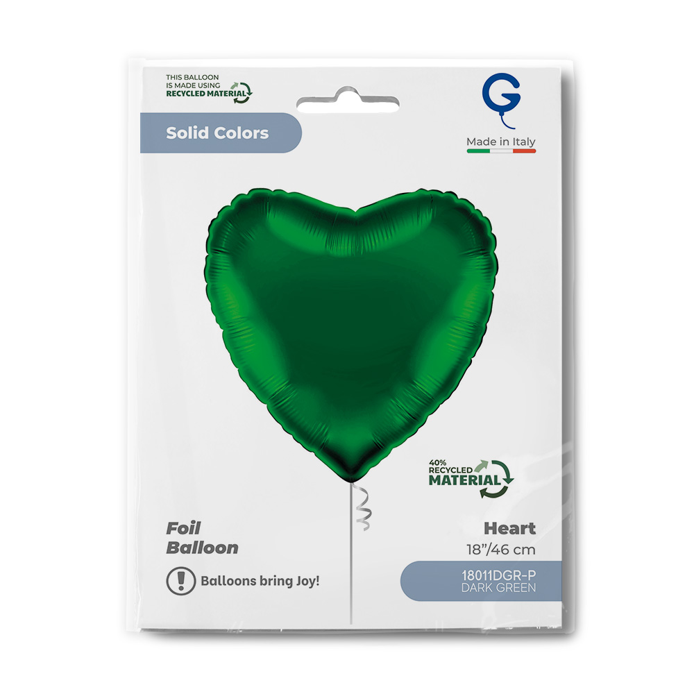 Parametry techniczne: Wymiary po napompowaniu: 36 x 36 cm Wymiary przed napompowaniem: ok. 45 cm (18") Pojemność: 14 l Materiał: folia metaliczna Kolor: ciemnozielony (Dark Green) Kształt: serce Inflacja: powietrze i hel Samozamykające: Tak Opakowanie komercyjne: Tak Opakowanie: 1 szt.