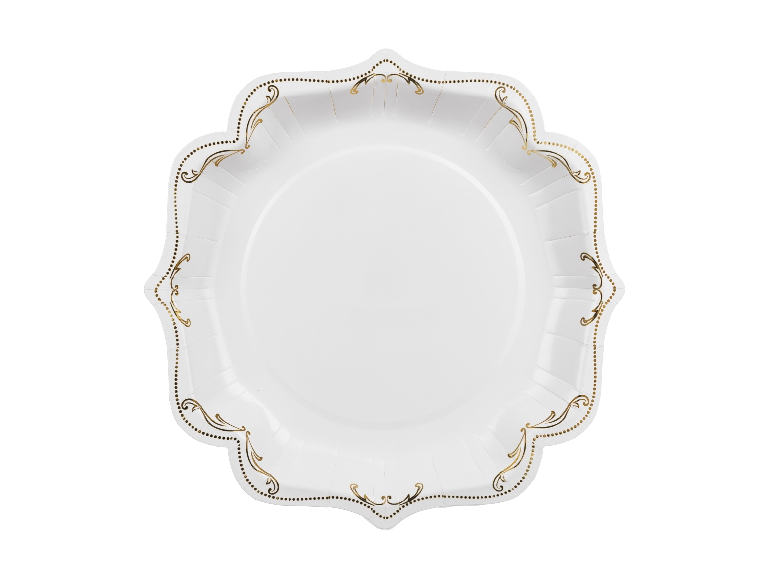 Parametry techniczne:Średnica: 26 cmKolor: biały ze złotym ornamentemKształt: ozdobny brzegMateriał: papierZastosowanie: dania na zimno i na ciepłoOpakowanie: 6 szt.
