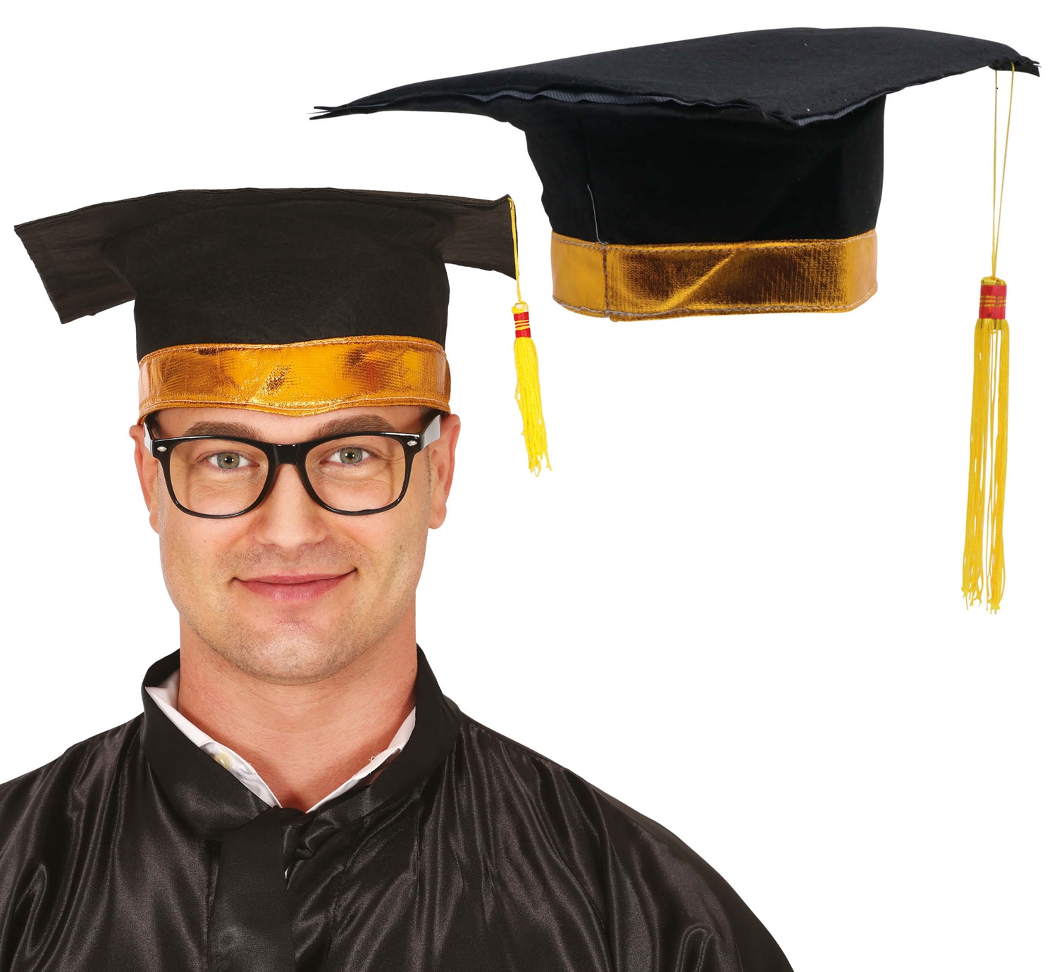 Technické parametre: Farba: čierna, zlatá Typ: absolventský klobúk Zdobenie: zlatý lem, strapec Balenie: 1 ks