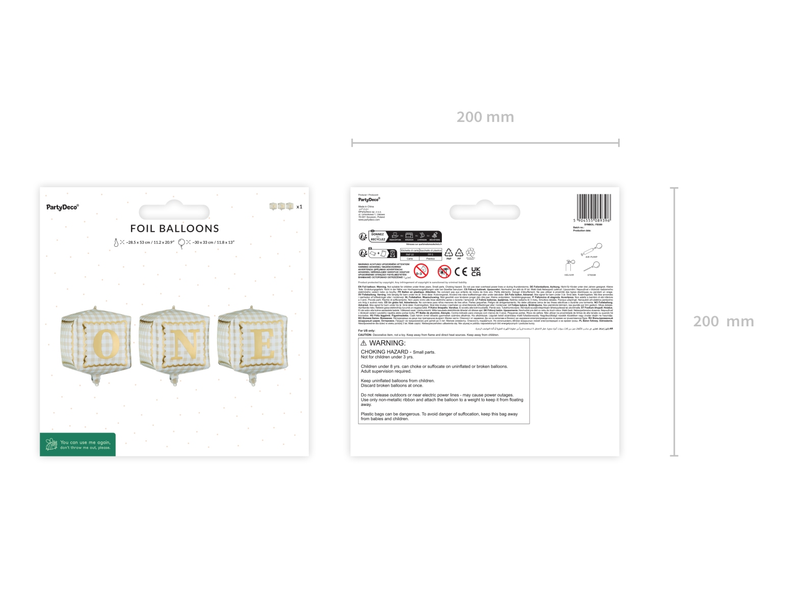 Fóliové balóny v tvare kociek s nápisom ONE sú obľúbenou dekoráciou na oslavu prvých narodenín. Každá kocka nesie jedno písmeno, ktoré spolu vytvárajú nápis ONE, vďaka čomu balóny krásne vyniknú samostatne aj ako súčasť balónovej výzdoby alebo girlandy. Jemný károvaný vzor v kombinácii béžovej a zlatej farby pôsobí elegantne a hodí sa pre chlapčenské aj dievčenské oslavy. Balóny sú vyrobené z kvalitnej fólie, majú samouzáver a sú určené na plnenie vzduchom aj héliom.