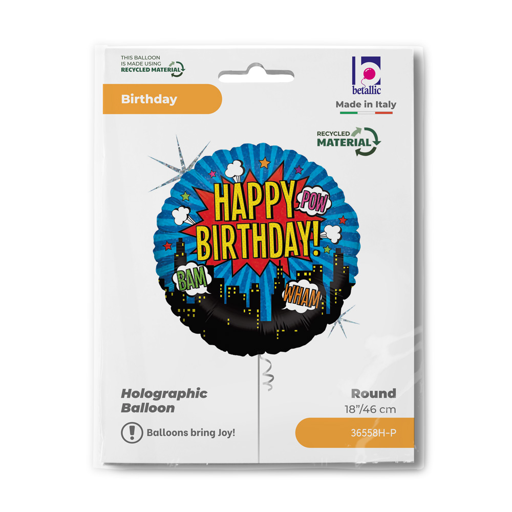 Vytvorte narodeninovú oslavu ako z komiksu! Tento okrúhly fóliový balónik s dizajnom nočného mesta a výrazným nápisom HAPPY BIRTHDAY! je ideálny na tematické superhrdinské párty.