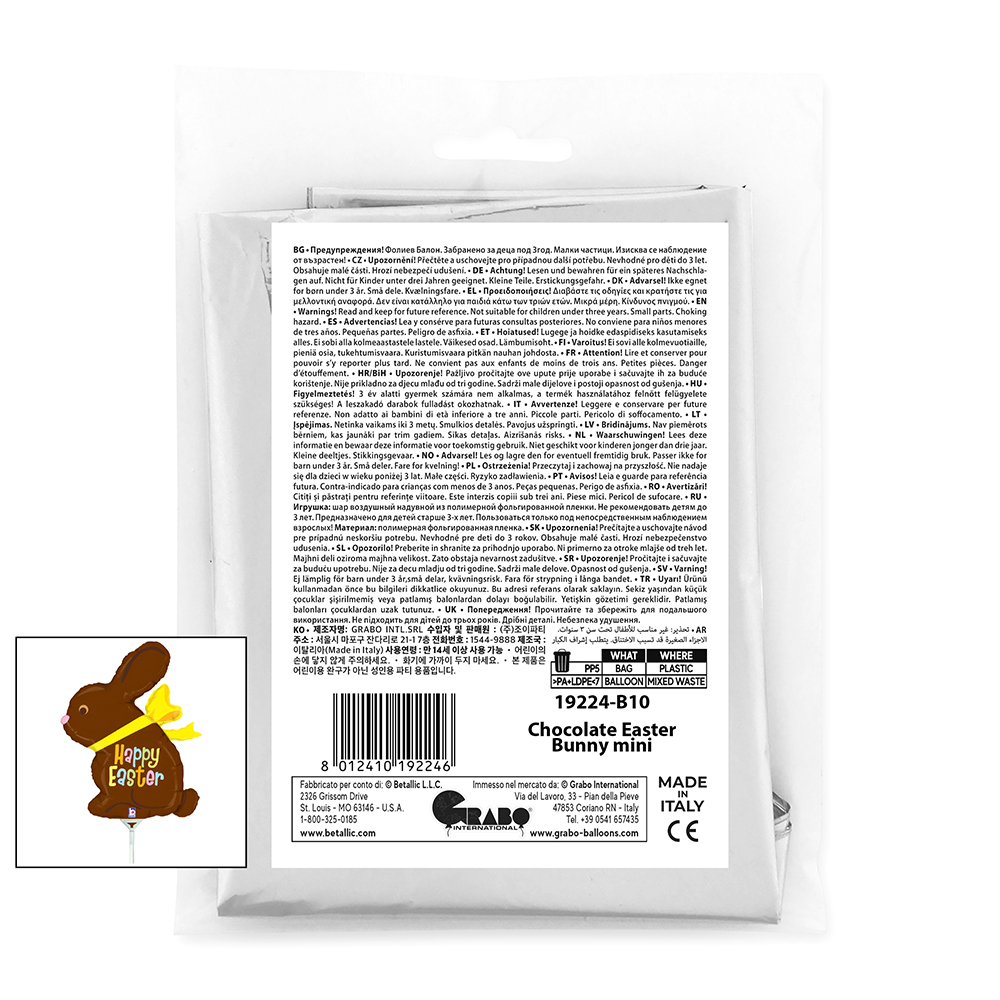Mini fóliový balónik Chocolate Easter Bunny prináša na Veľkú noc hravú atmosféru a čokoládový dizajn, ktorý si okamžite získa pozornosť. Skvelo doplní veľkonočné aranžmány, výzdobu záhrady aj detské oslavy. Vďaka kompaktnej veľkosti a jednoduchému nafúknutiu vzduchom je perfektný do košíkov, na stôl alebo ako malé prekvapenie. Balónik je ľahký, pevný a vďaka svojmu tvaru drží krásnu siluetu čokoládového zajačika so žltou mašľou.