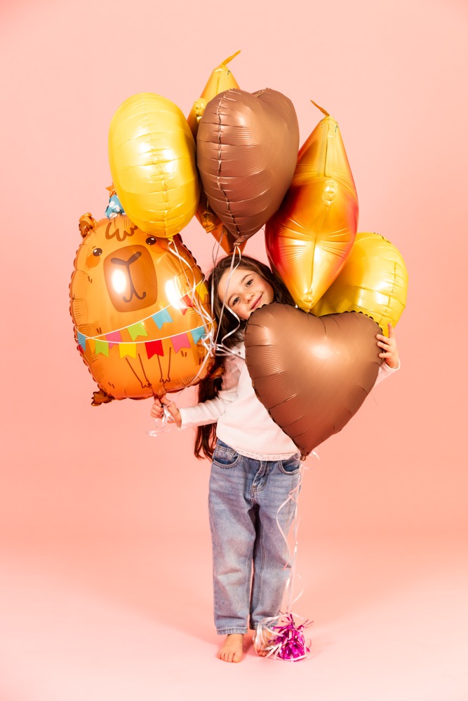 Originálny fóliový balónik v tvare kapybary s párty čiapočkou a farebnými zástavkami je skvelým doplnkom detskej oslavy aj tematickej párty. Balónik o veľkosti 58 cm je možné nafúknuť vzduchom aj héliom.