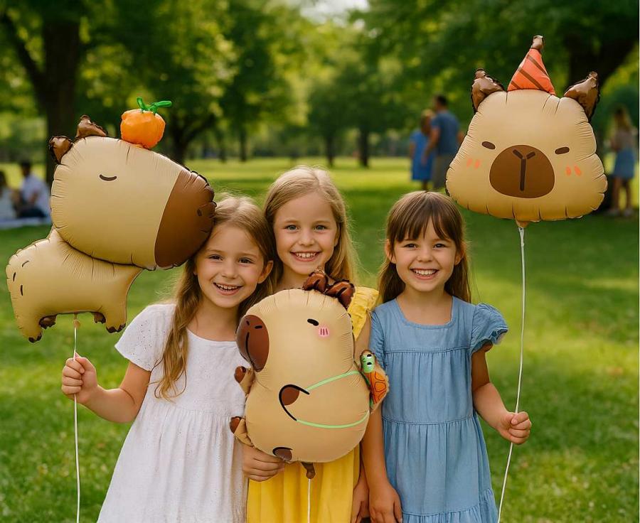 Fóliový balonek Kapybara s pomarančom prináša hravý a milý motív, ktorý poteší každé dieťa milujúce zvieratká. Kapybara s jemným úsmevom a roztomilým pomarančom na hlave pôsobí priateľsky a pokojne, takže je skvelým doplnkom na detské narodeniny, prírodné motívy alebo tematické oslavy so zvieratkami.