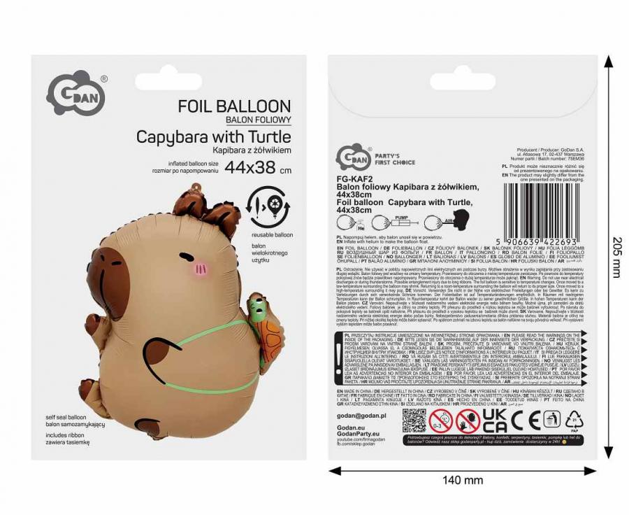 Fóliový balónik Kapybara so korytnačkou je roztomilou dekoráciou na detské oslavy aj tematické párty. Prinesie hravosť, jemný humor a očarí všetkých malých hostí. Možno ho plniť vzduchom aj héliom. Veľkosť po nafúknutí 44 × 38 cm.