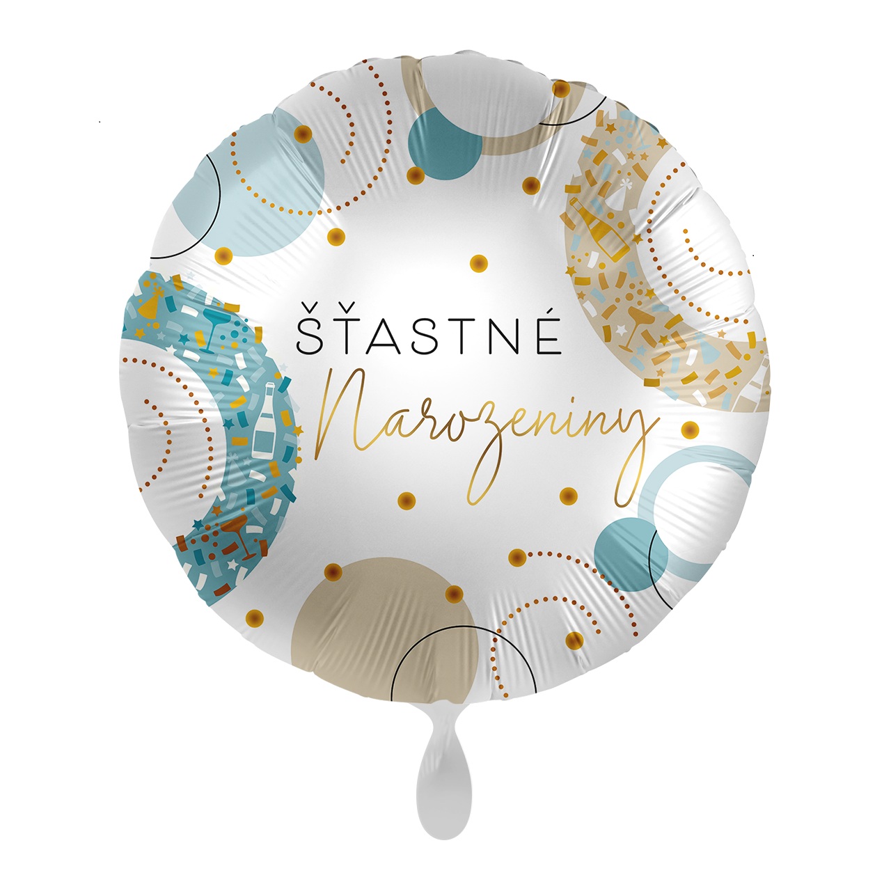 Fóliový balónik okrúhly s elegantným nápisom Šťastné narodeniny v kombinácii zlatej, modrej a bielej farby. Štýlová dekorácia na narodeninovú oslavu pre deti i dospelých. Určený na plnenie vzduchom aj héliom, vhodný samostatne aj do balónikových buketov.