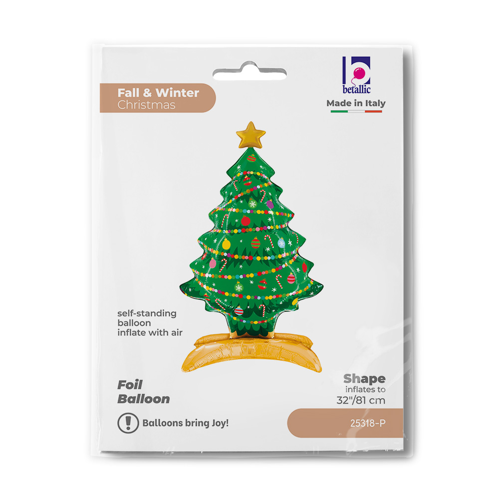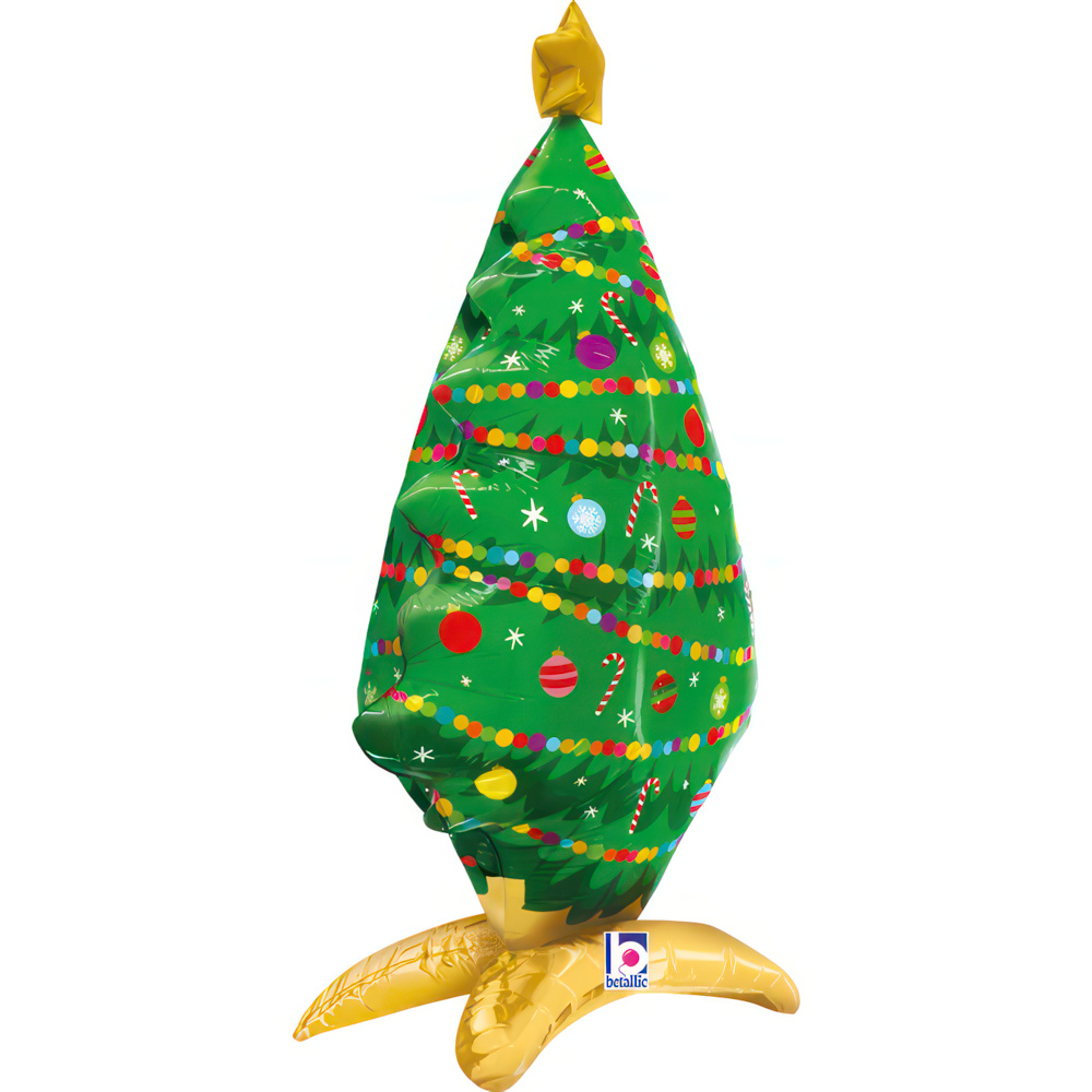 Stojaci fóliový balónik v tvare vianočného stromčeka je výbornou dekoráciou na sviatočné oslavy, firemné večierky aj domácu výzdobu. Balónik má krásnu potlač s ozdobami, cukrovými paličkami a ďalšími motívmi a po nafúkaní pôsobí ako malý 3D stromček. Vďaka pevnej zlatej základni sám stojí, takže ho môžete umiestniť kdekoľvek – na stôl, ku stromčeku, do detského kútika či k fotostene.