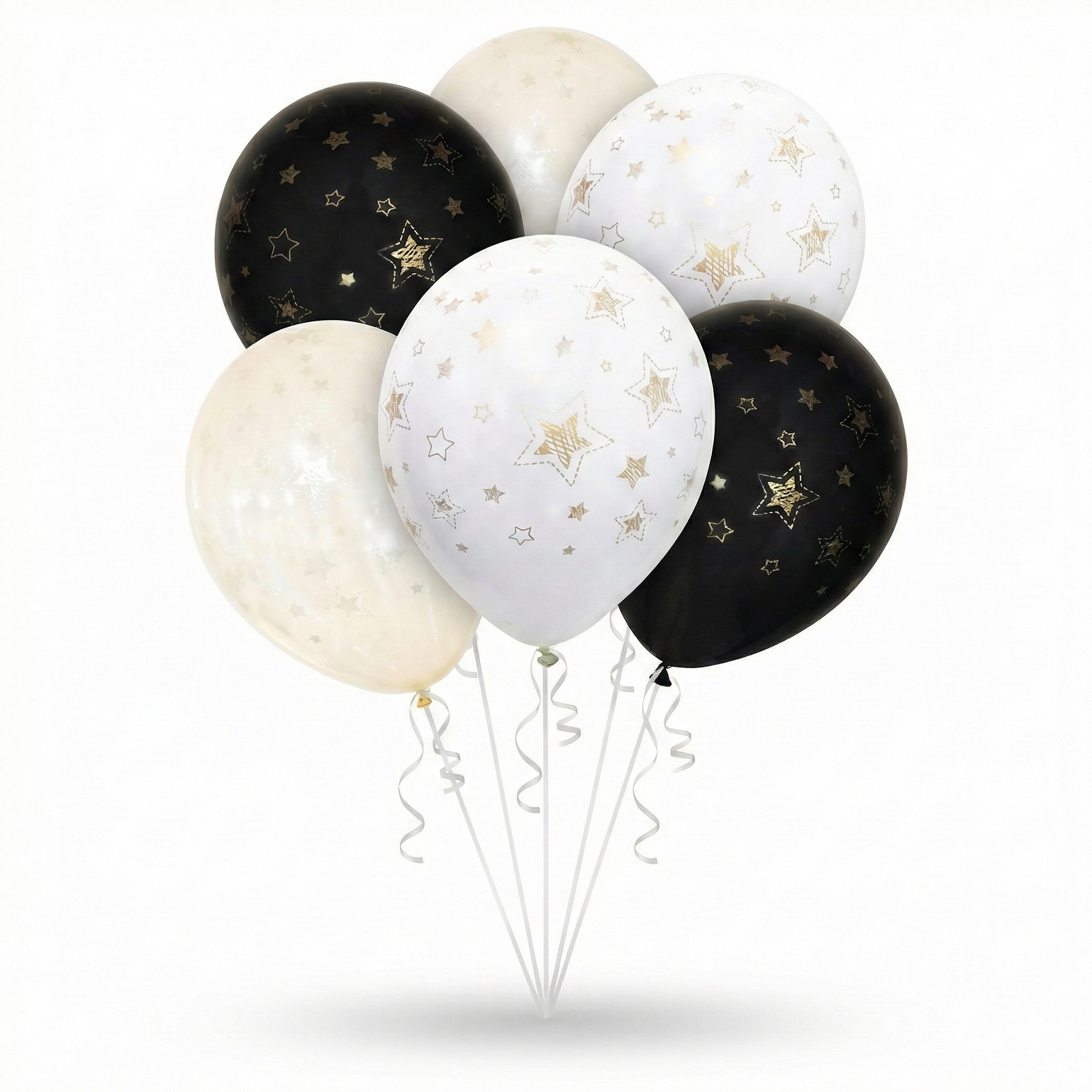 Latexové balóniky 30 cm v mixe čiernej, bielej a priehľadnej s potlačou zlatých hviezd. Elegantný výber na narodeniny, Silvester aj svadbu. Vhodné na vzduch aj hélium, balenie obsahuje 6 kusov.