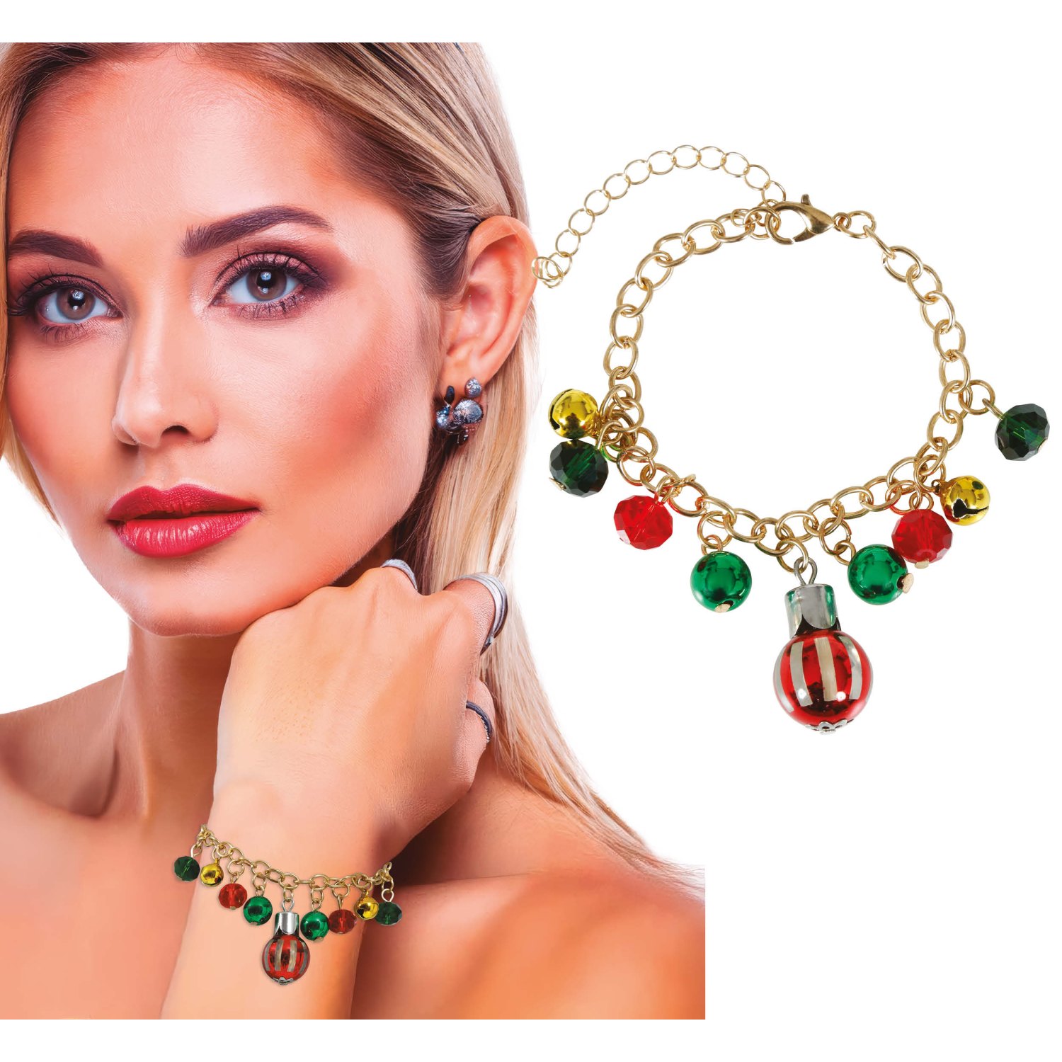 Tento vianočný náramok spája zlatú kovovú retiazku s farebnými ozdobnými guľami pripomínajúcimi tradičné vianočné dekorácie. Je ideálnym doplnkom k vianočnému outfitu, na firemné večierky, zimné párty, besiedky alebo ako malý darček. Farebné prvky v červenej, zelenej a zlatej vytvárajú výrazný sviatočný efekt.