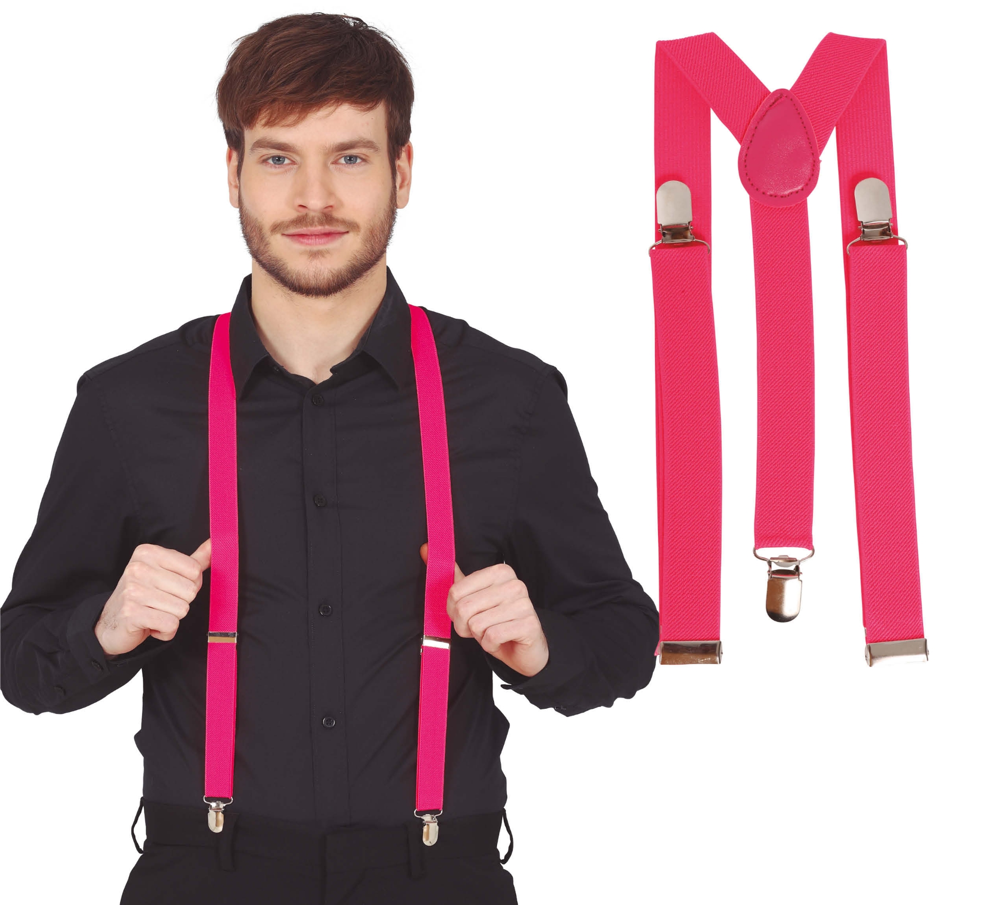 Neónové ružové traky (traky) vhodné ako univerzálny doplnok nielen ku kostýmu na tematickú párty, letnú oslavu alebo kostýmu tanečníka. Skvele sa hodí aj na bežné nosenie, alebo ako doplnok pre čašníkov a barmanov. Tento tip reaguje s neónovým svetlom a septembrom. Stačí doplniť štýlovou košeľou a je hotovo. Traky sa zapínajú pomocou cvočkov.