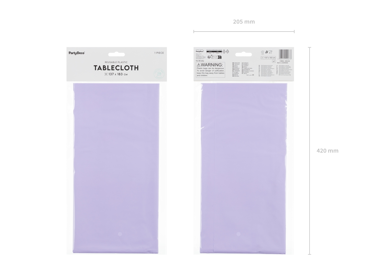 Levanduľový obrus o rozmere 137 × 183 cm je odolný, umývateľný a opakovane použiteľný. Dodá slávnostnému stolu jemný a romantický vzhľad, ideálny na svadby, narodeniny, baby shower aj záhradné oslavy.