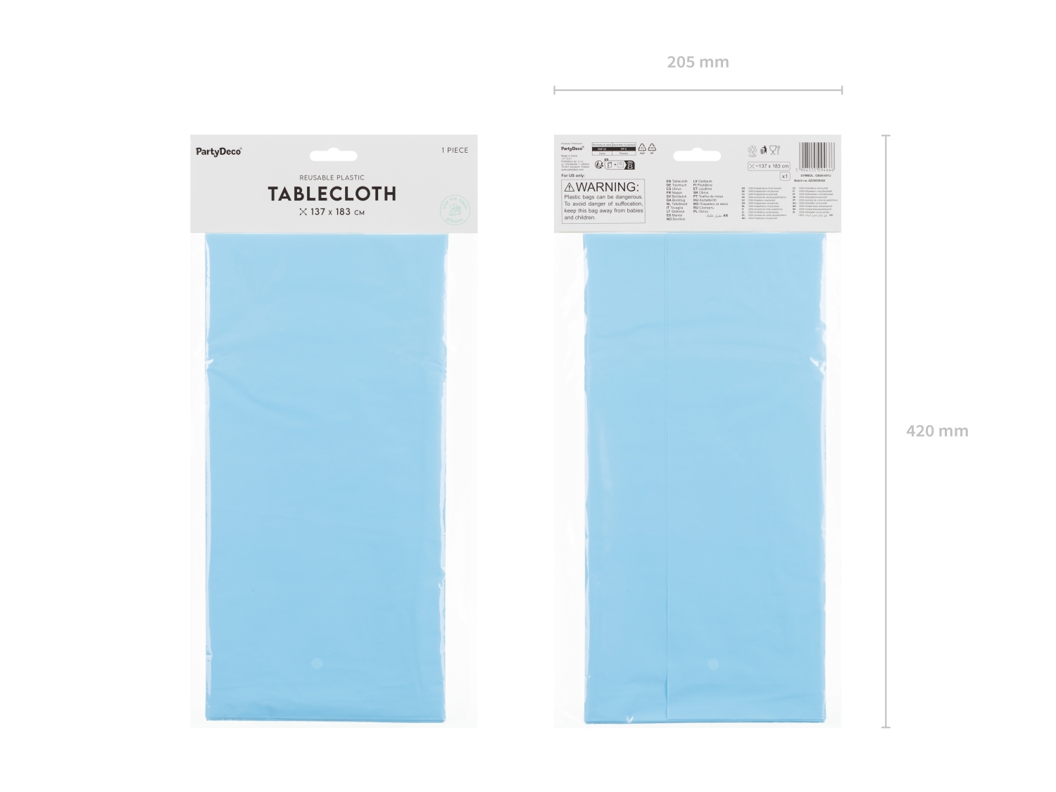 Svetlomodrý obrus s rozmerom 137 × 183 cm je odolný, umývateľný a opakovane použiteľný. Jemný pastelový odtieň sa hodí na svadby, baby shower, narodeniny aj letné záhradné oslavy.