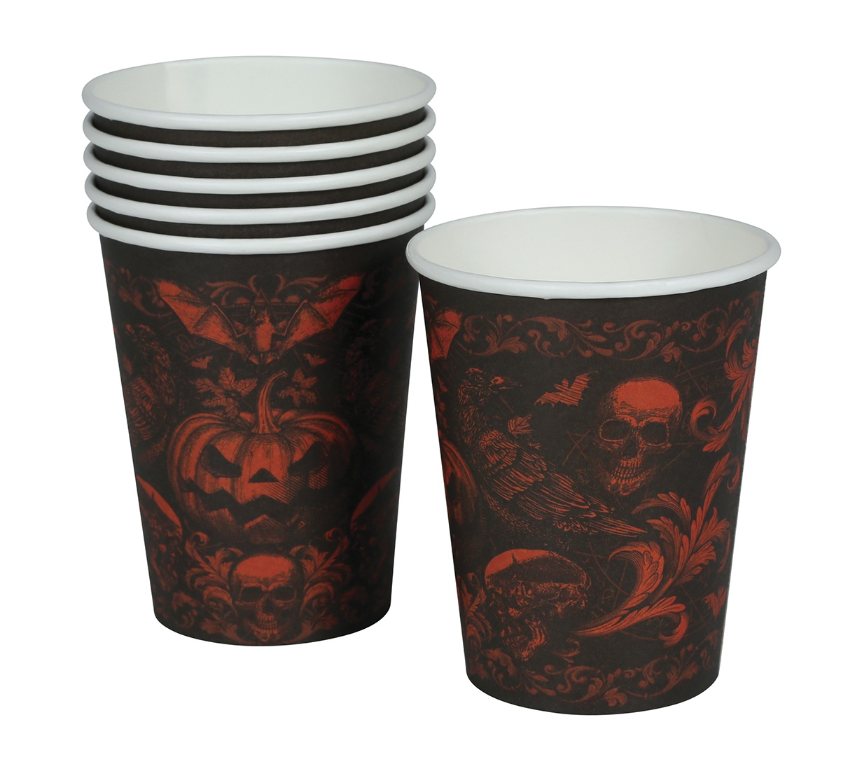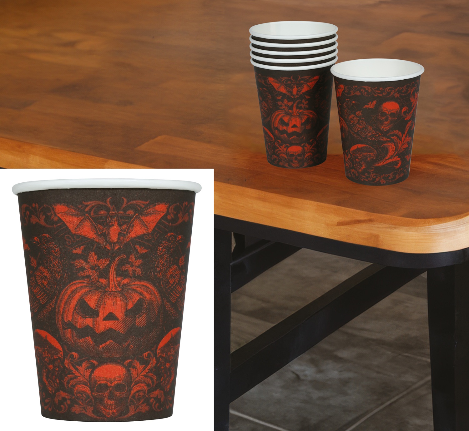 Papierové kelímky Gothic Pumpkin s gotickým motívom tekvice, netopiera a lebiek dodajú vašej halloweenskej oslave temne štýlovú atmosféru. Balenie obsahuje 6 téglikov s objemom 240 ml.