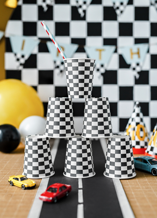 Papierové kelímky Závodné autá 6 ks. Tégliky s potlačou cieľovej pásky, budú nepostrádateľným doplnkom každej oslave narodenín, tematickej párty alebo záhradné oslavy. Sú tiež veľmi praktické, tégliky po použití jednoducho ekologicky zlikvidujete, bez nutnosti umývania.