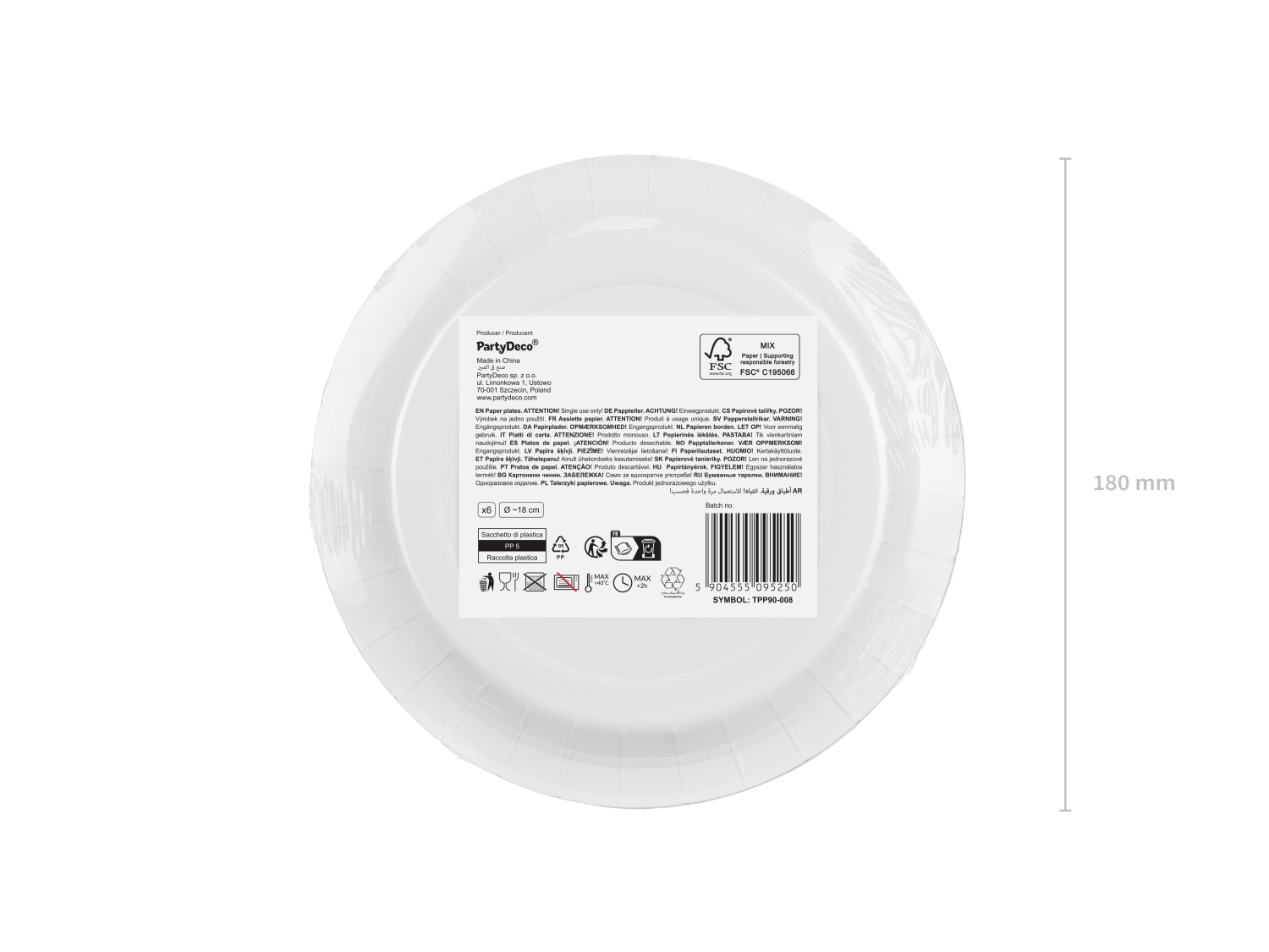 Papierové taniere v bielej farbe s priemerom 18 cm. Praktický jednorazový riad na torty, dezerty aj menšie občerstvenie. V balení 6 kusov.
