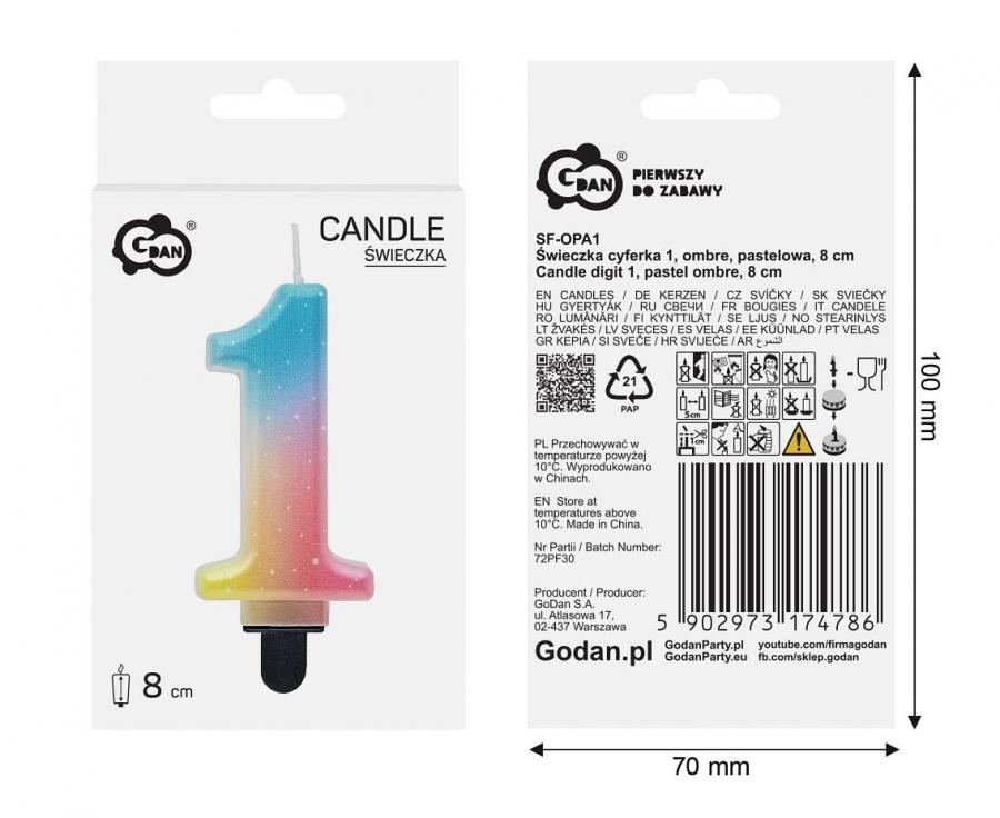 Narodeninová sviečka v tvare číslice 1 v atraktívnom pastelovo dúhovom prevedení s jemným prechodom farieb od modrej cez ružovú až po žltú. Drobné biele bodky dodávajú sviečke veselý a slávnostný vzhľad. Skvele sa hodí na tortu pri oslave prvých narodenín, baby shower alebo detskej párty s motívom jednorožcov, dúhy a pastelových farieb.