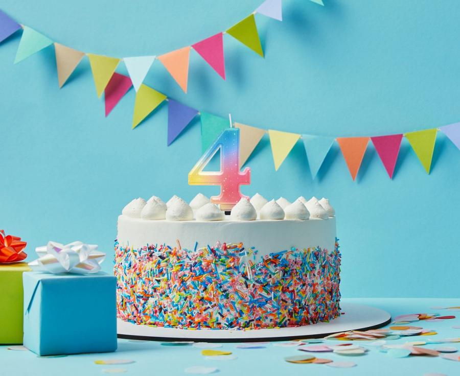 Sviečka narodeninová v tvare číslice 4 v očarujúcom pastelovo dúhovom dizajne s prechodom modrej, ružovej a žltej. Celý vzhľad dopĺňajú jemné biele bodky, ktoré vytvárajú efekt slávnostného zdobenia. Ideálna voľba pre oslavu štvrtých narodenín, ale aj ako súčasť väčšej číselnej kombinácie.
