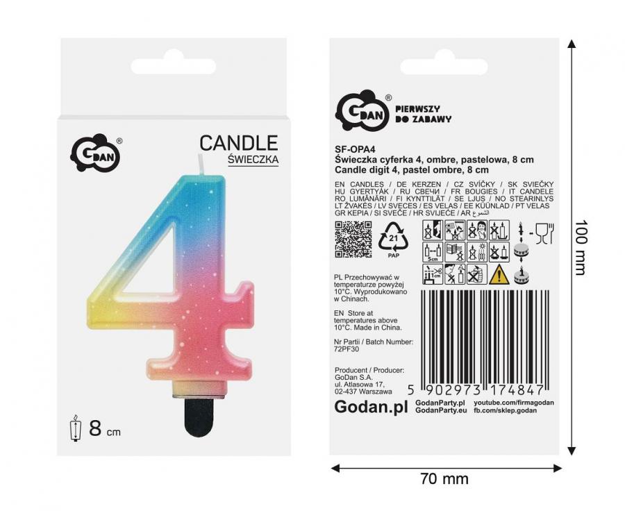 Pastelová narodeninová sviečka v tvare číslice 4 s jemným dúhovým prechodom a bielymi bodkami. Skvelý doplnok na detské oslavy a torty.