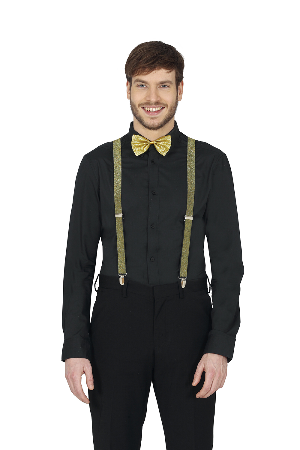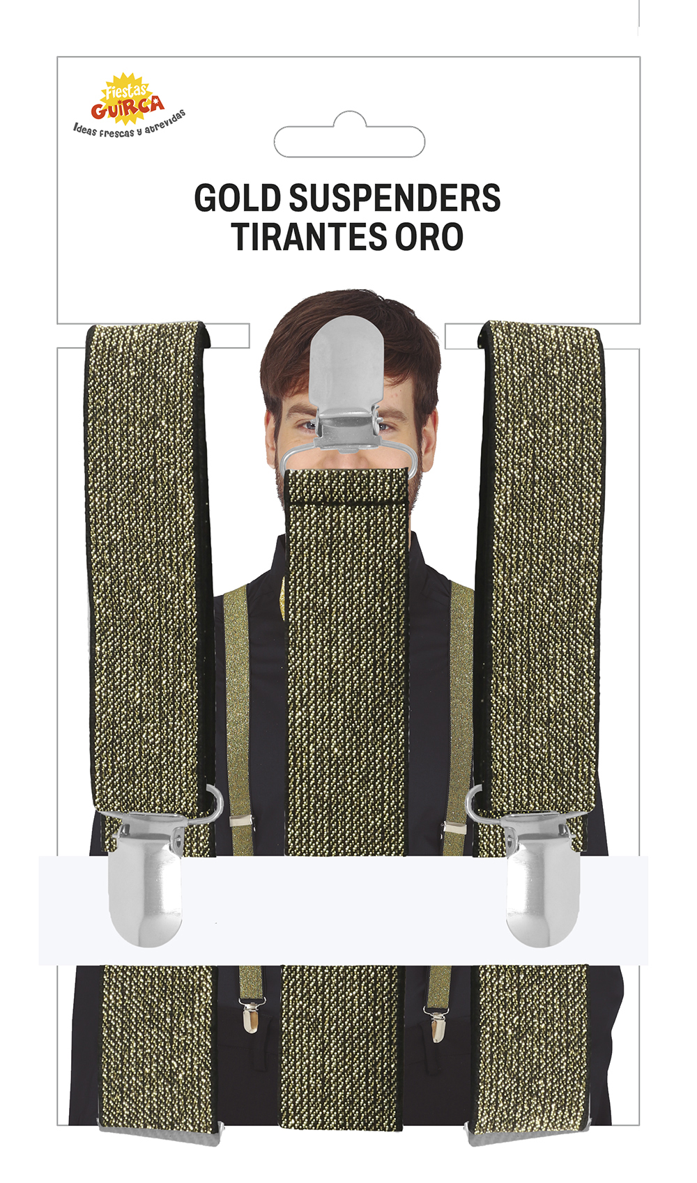 Zlaté traky (traky) vhodné ako univerzálny doplnok nielen ku kostýmu mafiána alebo tanečníka. Skvele sa hodí aj na bežné nosenie, alebo ako doplnok pre Vianočnú alebo silvestrovskú párty. Stačí doplniť štýlovou košeľou a je hotovo. Traky sa zapínajú pomocou cvočkov.