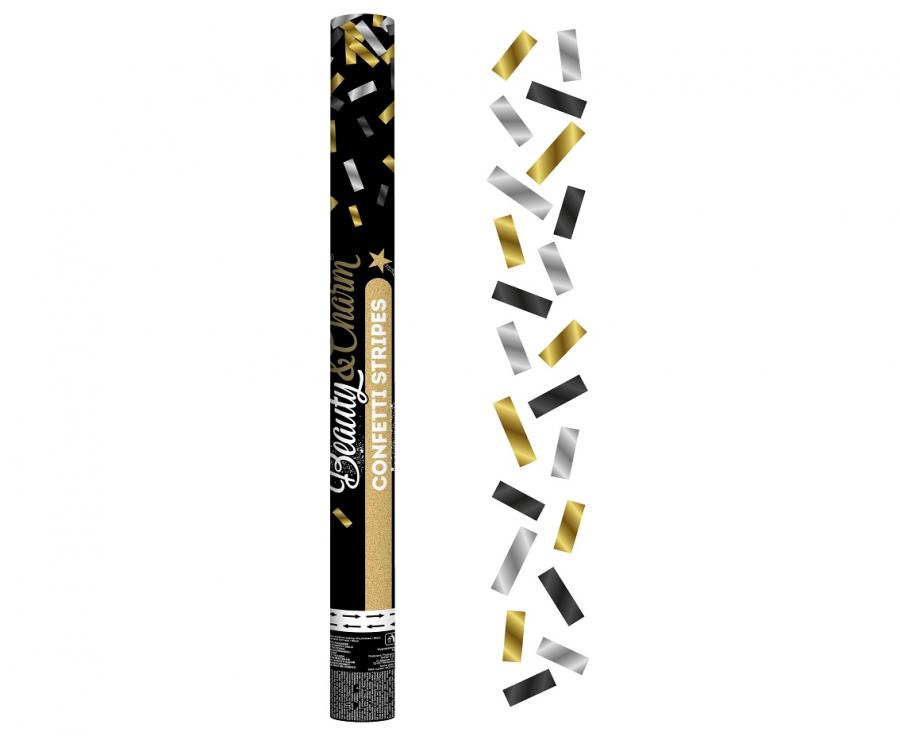 Vystreľovacie konfety v elegantnom mixe zlatej, striebornej a čiernej farby v tubuse s dĺžkou 60 cm. Výrazný párty efekt na oslavy, večierky aj silvestrovské akcie. Aktivácia stlačeným vzduchom, bez pyrotechniky.