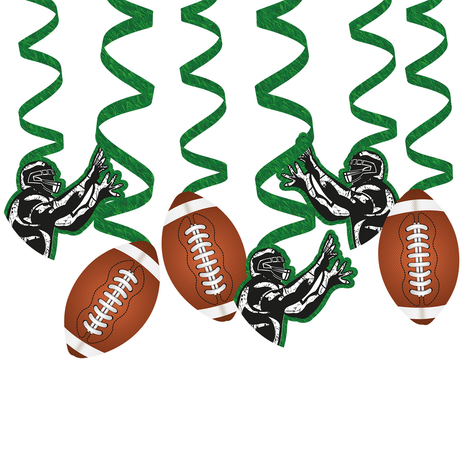 Závesné špirály Touch Down Party sú štýlovou dekoráciou pre všetkých fanúšikov amerického futbalu a športových osláv. Motív hráča chytajúceho loptu a typickej futbalovej lopty okamžite vytvorí atmosféru štadióna a skvele doplní výzdobu tematickej party.
