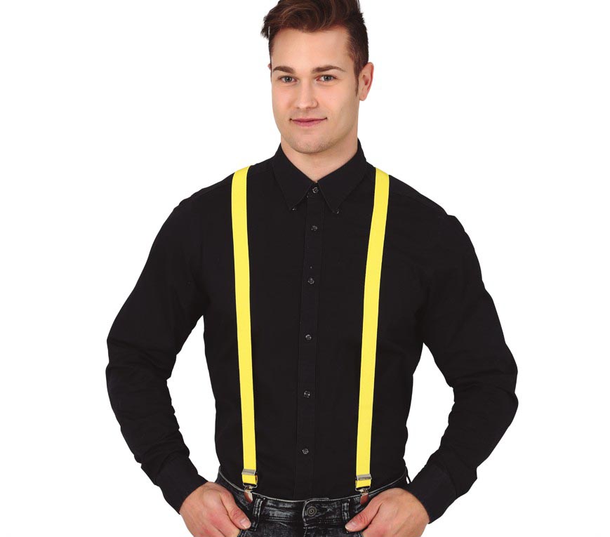 Žlté traky (traky) vhodné ako univerzálny doplnok nielen ku kostýmu na tematickú párty, letnú oslavu alebo kostýmu tanečníka. Skvele sa hodí aj na bežné nosenie, alebo ako doplnok pre čašníkov a barmanov. Stačí doplniť štýlovou košeľou a je hotovo. Traky sa zapínajú pomocou cvočkov.